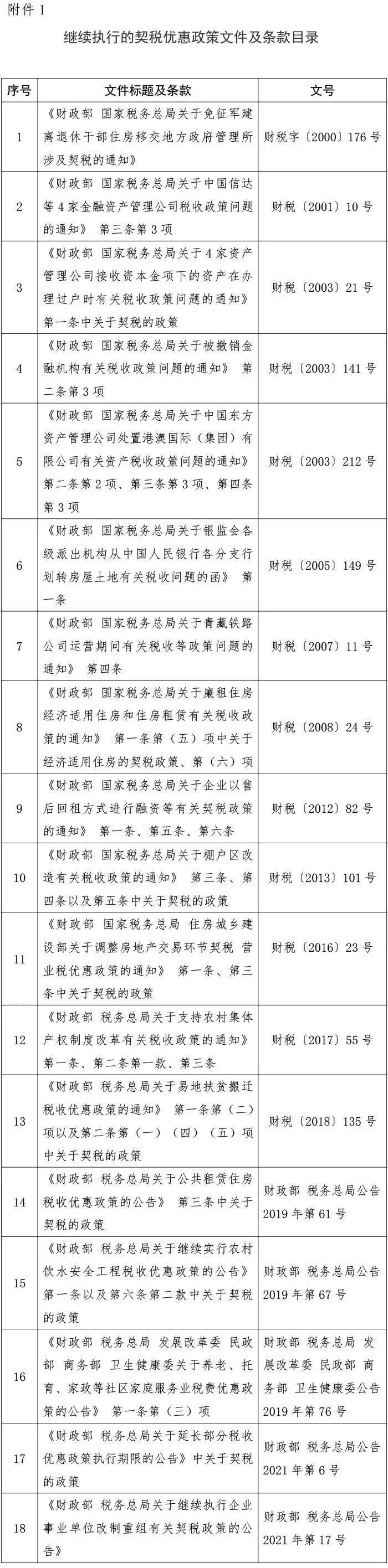 繼續執行的契稅優惠政策文件及條款目錄